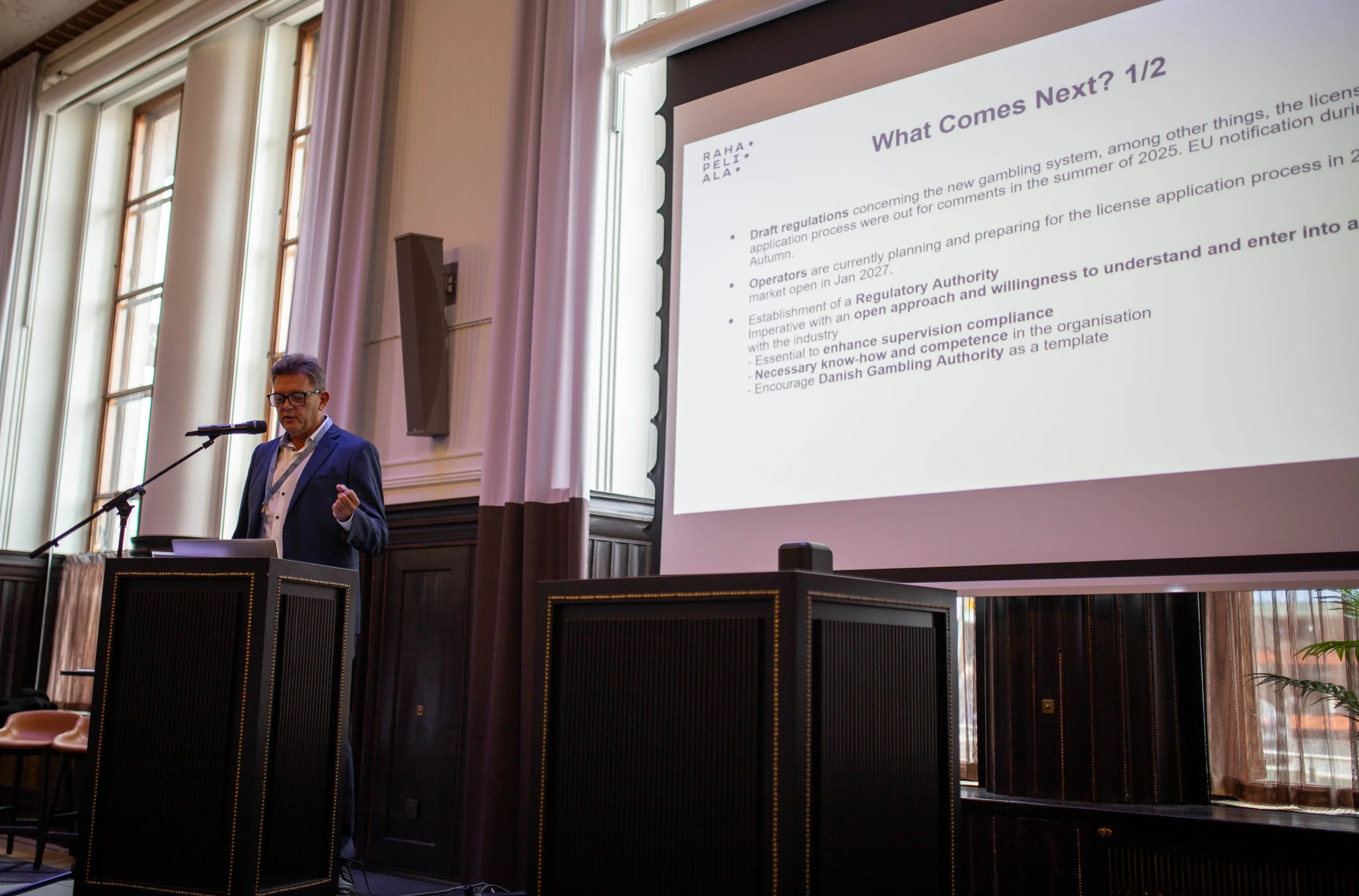 Päivän ensimmäisistä kansainvälisistä näkökulmista vastannut Rolf Sims (Head of Corporate Affairs Nordics & Eastern Europe, FDJ United; Rahapeliala ry:n hallituksen puheenjohtaja) käsitteli puheessaan toimialan näkemyksiä Suomen rahapelijärjestelmän uudelleensääntelyprosessista.